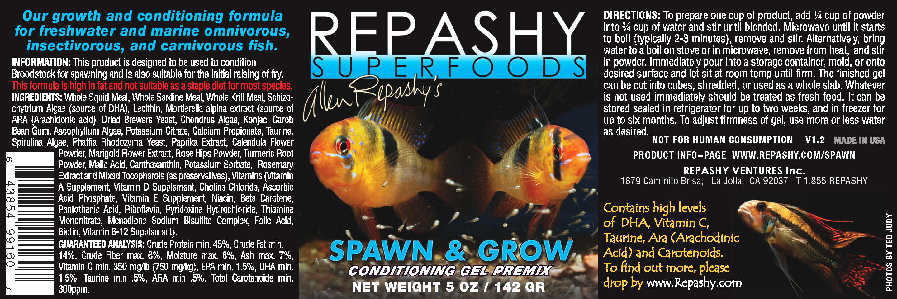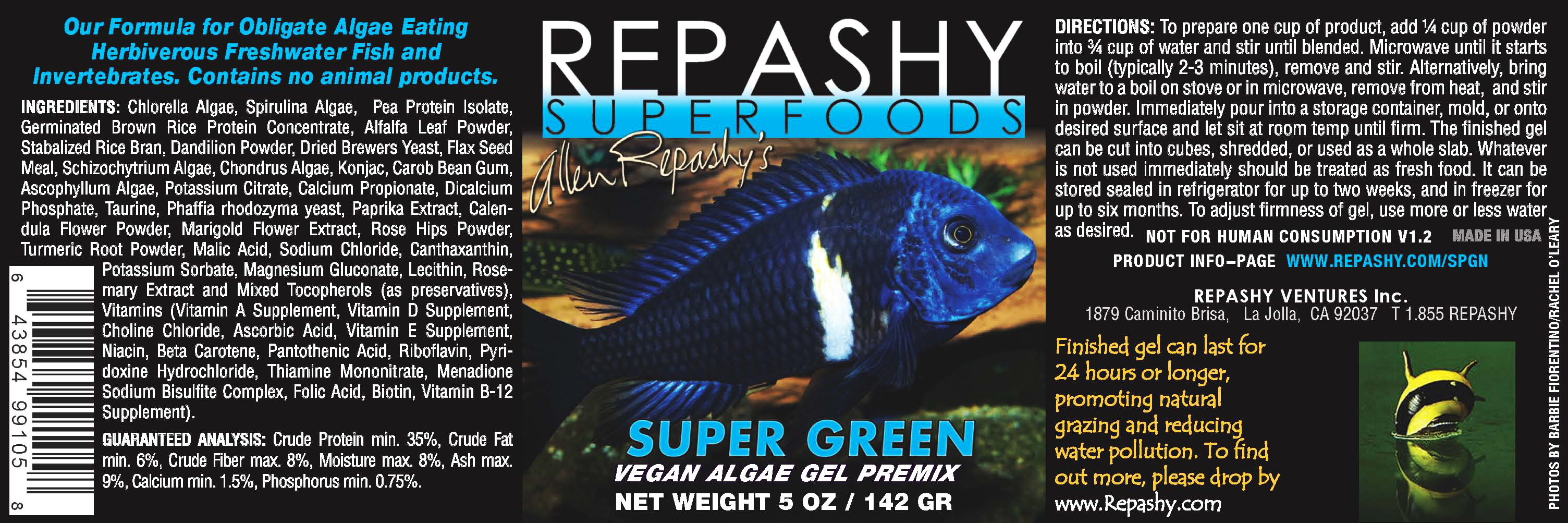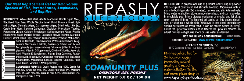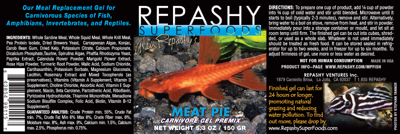 Repashy Superfoods uses only the highest quality, whole-animal ingredients available; Repashy Superfoods uses whole fish (sardine/anchovy), whole squid, and whole krill as the backbone of the fish food except in the vegan formulas, which mainly contain algae (chlorella/spirulina/schizochytrium/kelp) and green plant proteins from green peas and alfalfa leaves. The gels are 100% free of starch or gluten binders and gelatin. NO fish meal, fish oil, terrestrial meat or soy proteins, wheat gluten, wheat or corn starches, or other ingredients that are industry byproducts. Most dry fish foods contain ample amounts of wheat, corn, or soy to hold the food together and add cheap protein content but they can cause bloat. And many gel foods contain up to 20% gelatin, an irreversibly hydrolyzed form of collagen, to gel the food. When the typical label reads 30-50% protein, over half may be collagen or gluten, which are indigestible for most fish. So half the nutritional content of a typical fish food might be polluting your water, not feed your fish, while costing you money.