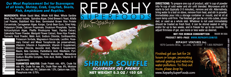DESCRIPTION: This fresh and saltwater “scavenger formula” is an omnivore formula specifically designed for aquatic and semi-aquatic invertebrates and mollusk eaters. Shrimp Soufflé is high in calcium, and has double the carotenoid levels of the other Repashy Gel formulas to provide essential nutrients for a strong exoskeleton and great coloration. Omnivorous species of shrimps, crabs, and crayfish, as well as many species of loaches have an extremely high attraction to mollusks, therefore whole squid (a mollusk) is the primary ingredient in this formula to maximize palatability. It has moderate levels of proteins from a combination of algae, aquatic animals, green plants, and yeast to replicate the diverse diet of scavenging species. Shrimp Soufflé is also ideal for omnivorous species, particularly as a color enhancer because of its higher carotenoid levels.