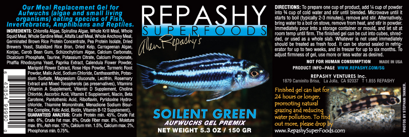 DESCRIPTION: This fresh and saltwater formula is labeled for “aufwuchs” eaters. Aufwuchs is a combination of green algae, diatoms, and small plants, along with tiny organisms such as insect larvae, crustaceans, rotifers, protozoans, and snails that live with them on the surface of hard substrates such as rocks. Many species of fish such as Mbuna cichlids, various plecos and gobies are specialized to feed on aufwuchs by scraping hard surfaces for whatever nutrients they can find. These species do eat a lot of low-caloric algae, but it is the small meaty treats that they relish and what really makes them grow and thrive. Soilent Green is a no-expense-spared blend of algae (25% of formula), combined with the highest quality whole aquatic animal ingredients, to provide a perfect balance of plant and animal proteins. Soilent Green is perfect for more herbivorous fish, shrimps, crabs, and snails.